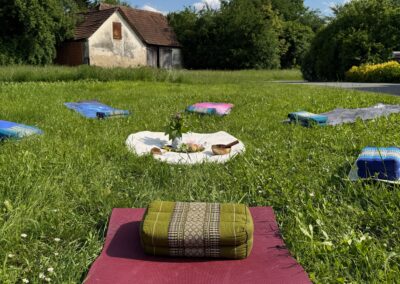 Yogamatte: outdoorfähig – die du direkt auf die Wiese legen kannst, ansonsten evtl. ein Badetuch zum Darunterlegen, falls der Boden sehr nass ist